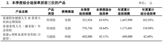 报告披露,2025年第三季度综合退保率居前三位的产品分别为泰康附加健康人生B款重大疾病定期保险、泰康泰悦人生(赢家版)年金保险、泰康e理财B款终身寿险(万能型),年度累计综合退保率182.92%、110.94%、42.6%。