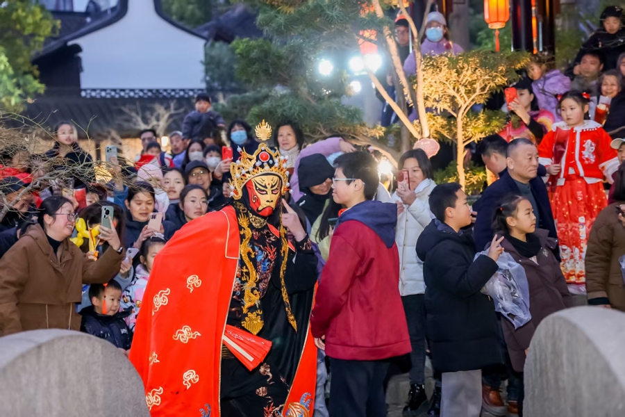 “凤箫声动,玉壶光转,一夜鱼龙舞。”提着花灯的小朋友吟诵着元宵节的古诗,迎接市民入园游玩,风雨廊内也已经有不少身着汉服的市民在拍照打卡。在接景廊,灯谜长龙曲折蜿蜒,小朋友们猜着灯谜欢声笑语;在水月亭,多彩造型灯光将园子里营造得优雅多姿;在镜心庐,群众在此纳福送福,送上新年美好祝愿;在迎曦亭、湖畔亭内,上演丝竹民乐;在紫藤廊,绚丽多姿的灯笼通道成为汉服仙女的打卡专属地;在石鼓亭,百戏精粹轮番上演,推动游园会进入高潮……丝竹雅乐与园林景致完美相融,让人沉浸式感受传统文化的魅力。