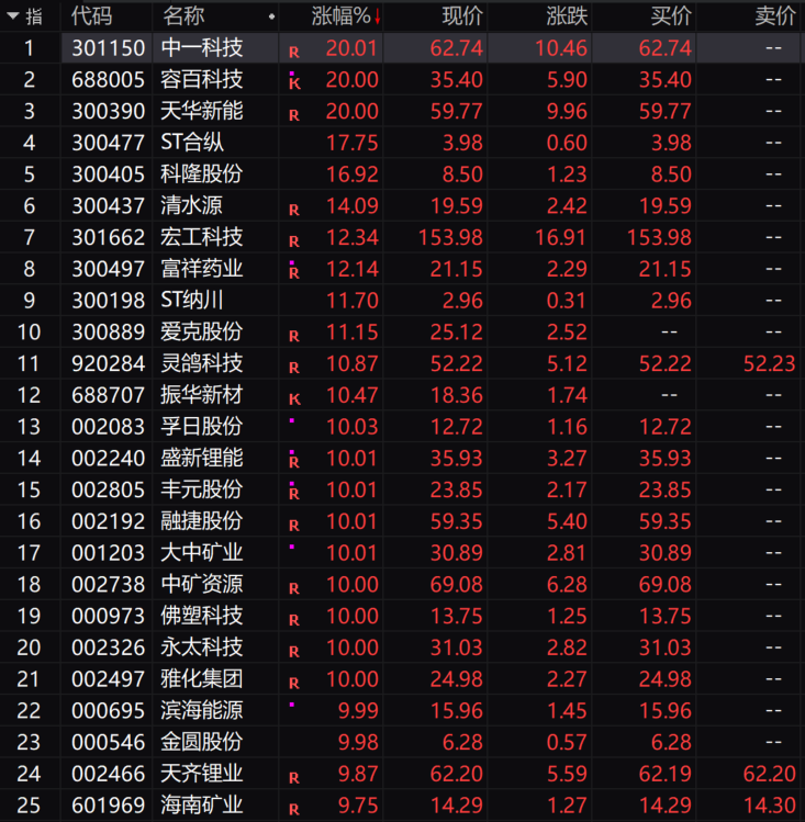 一是,碳酸锂期货主力合约触及涨停,涨幅9%,报95200元/吨。受此影响,锂电池板块再现涨停潮,容百科技、天华新能、中一科技、科隆股份、孚日股份、盛新锂能等23股涨停或涨超10%。